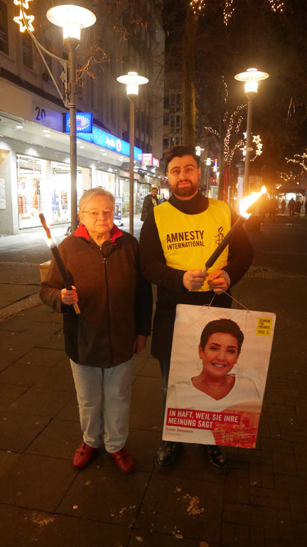 Anlässlich des Tags der Menschenrechte (10.12.20) gehen zur Zeit Mitglieder der Amnesty-Gruppe Hagen unter Einhaltung der Corona-Vorschriften mit Sandwich-Plakaten durch die Stadt. Durch diese Aktion sollen die Hagener auf das Schicksal von Menschenrechtsverteidigern und Menschenrechtsverteidigerinnen aufmerksam gemacht werden. Die Plakate zeigen Ahmet Altan (Türkei), RazanZaitouneh (Syrien), Nasrin Sotoudeh (Iran) und Zakir Majeed Baloch (Pakistan). Die iranische Menschenrechtsanwältin Nasrin Sotoudeh (Bild siehe unten) erhielt vor kurzem den Alternativen Nobelpreis. Sie wurde für ihr "furchtloses Engagement zur Förderung politischer Freiheiten und der Menschenrechte im Iran" ausgezeichnet. Nasrin Sotoudeh setzt sich für die Rechte von politischen Gefangenen, oppositionellen Aktivisten, Frauen und Kindern ein.